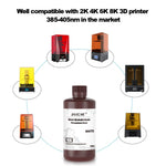 Les pièces imprimées à base de résine water washable 10k Jamg He sont très rigides et solides après post-traitement (shore 80-85D). Elle est compatible avec toutes les imprimantes 3D du marché disposant d'une longueur d'ondes entre 385 et 405 nm.